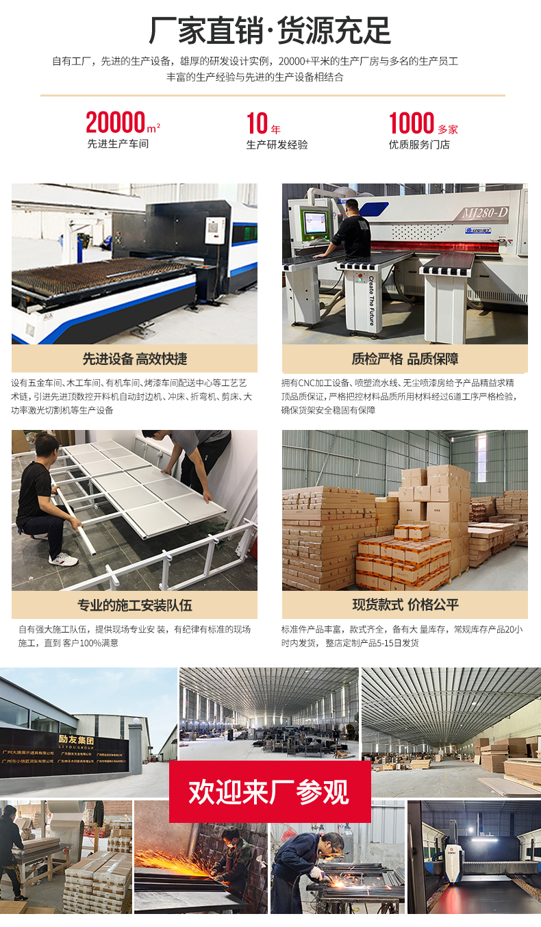 自有強大施工隊伍,提供現場專業安裝,有紀律、有標準的現場施工,直到客戶100%滿意,常規庫存產品24小時內發貨,整店定制產品5-15日交貨