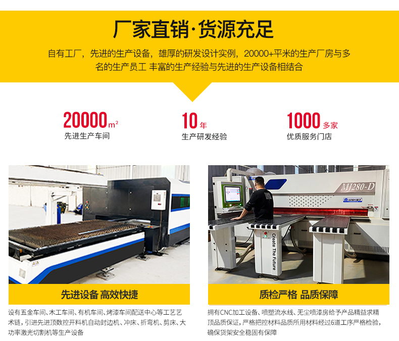 設有五金車間、木工車間、有機車間、烤漆車間、配送中心等工藝產業鏈,引進先進的數控開料機、自動封邊機、沖床、折彎機、剪床、大功率激光切割機等生產設備