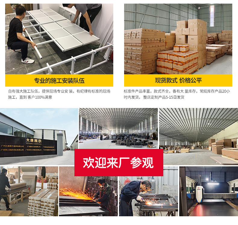 自有強大施工隊伍,提供現場專業安裝,有紀律、有標準的現場施工,直到客戶100%滿意,常規庫存產品24小時內發貨,整店定制產品5-15日交貨